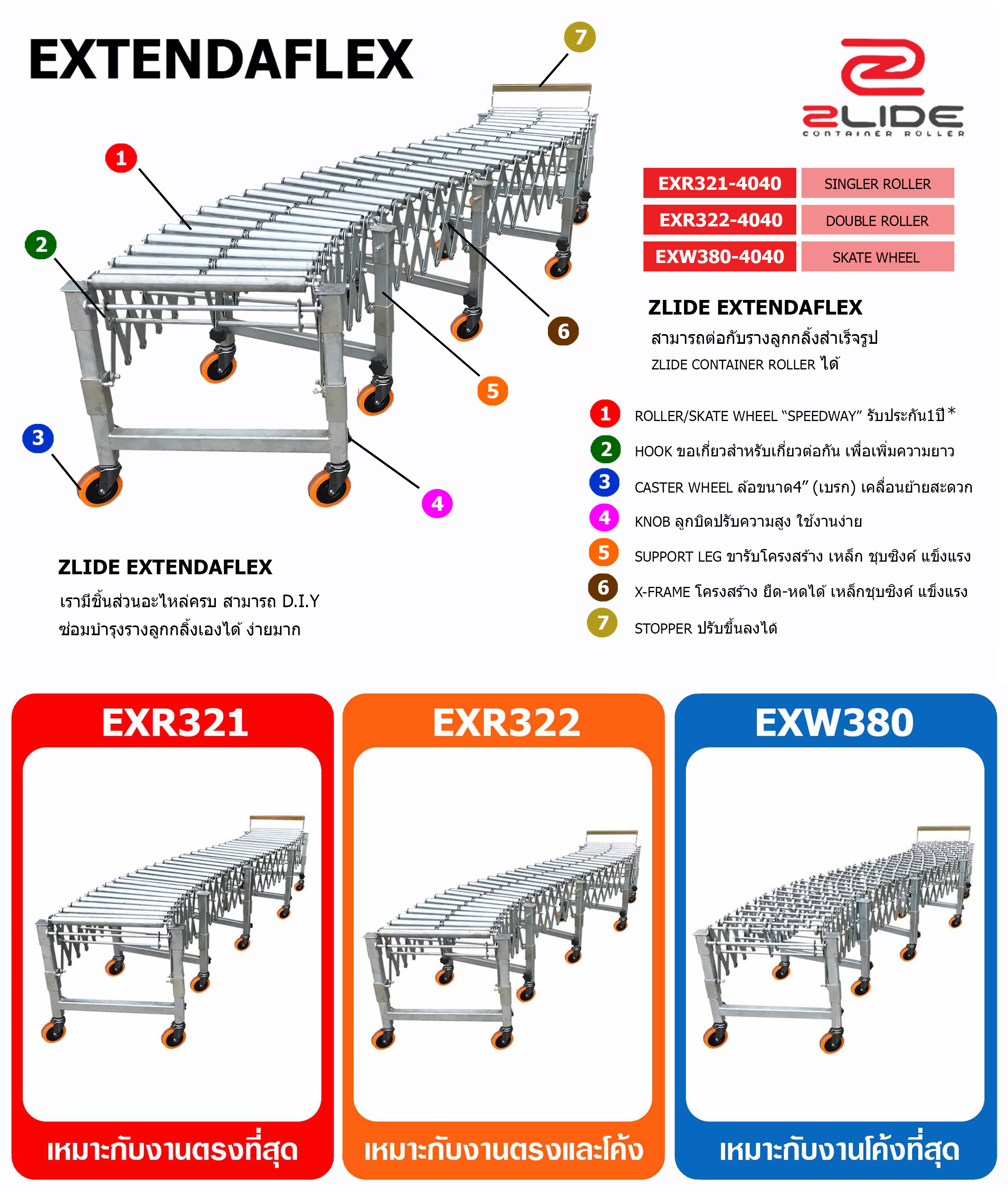EXTENDAFLEX รางลูกกลิ้งลำเลียง มีความสามารถ ปรับเพิ่มหรือลดความยาวได้ (ยืดหดได้) ปรับระดับความสูงในการใช้งานได้ มีล้อ เคลื่อนที่ได้สะดวก ความยืดหยุ่นและคล่องตัวสูง เป็นรางลูกกลิ้งที่ปรับใช้งานได้หลายแบบ โครงสร้างทั้งหมดเป็น Znplating Steel สามารถสั่งผลิต รุ่น วัสดุแสตนเลส สำหรับใช้ในงานที่มีความชื้นสูง และสั่งผลิตขนาดพิเศษ (กว้างxยาวxสูง) ตามต้องการได้ *